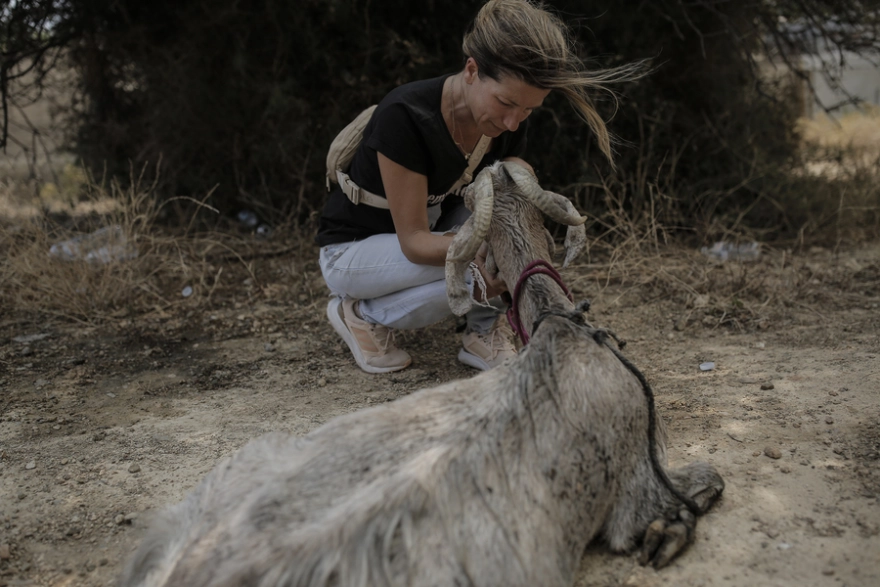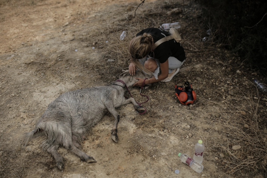 Κάτοικοι αλλά και εθελοντές κρατούν στην αγκαλιά τους ζωάκια προκειμένου να τα απομακρύνουν από τις φλόγες και να τα σώσουν από την πύρινη λαίλαπα.