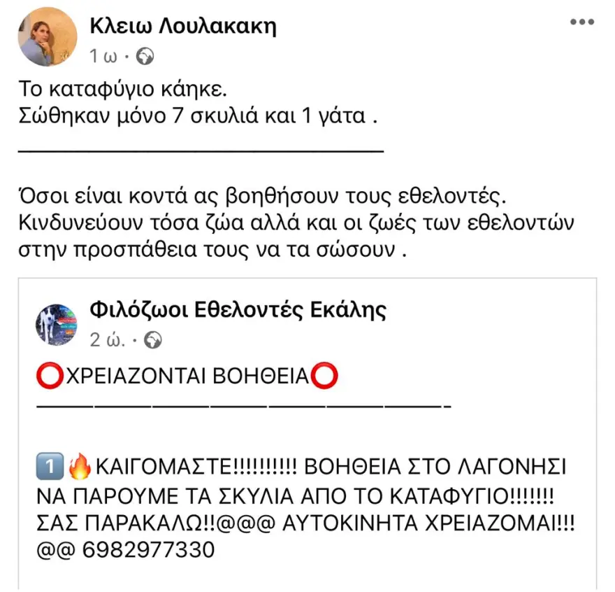 Σύμφωνα με την ανακοίνωση των Φιλόζωων Εθελοντών Εκάλης, που έκανε γνωστό ότι καίγεται το καταφύγιο στο Λαγονήσι, «οποιοσδήποτε χρειάζεται μεταφορά και απεγκλωβισμό μεγάλου αριθμού ζώων από καταφύγια με φορτηγά παρακαλούμε να μας καλέσει στο 2131364020».