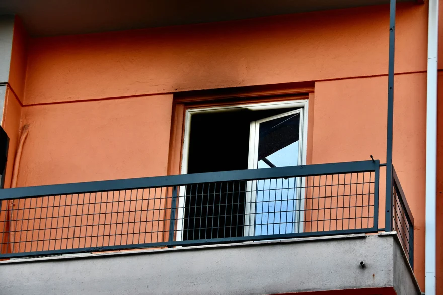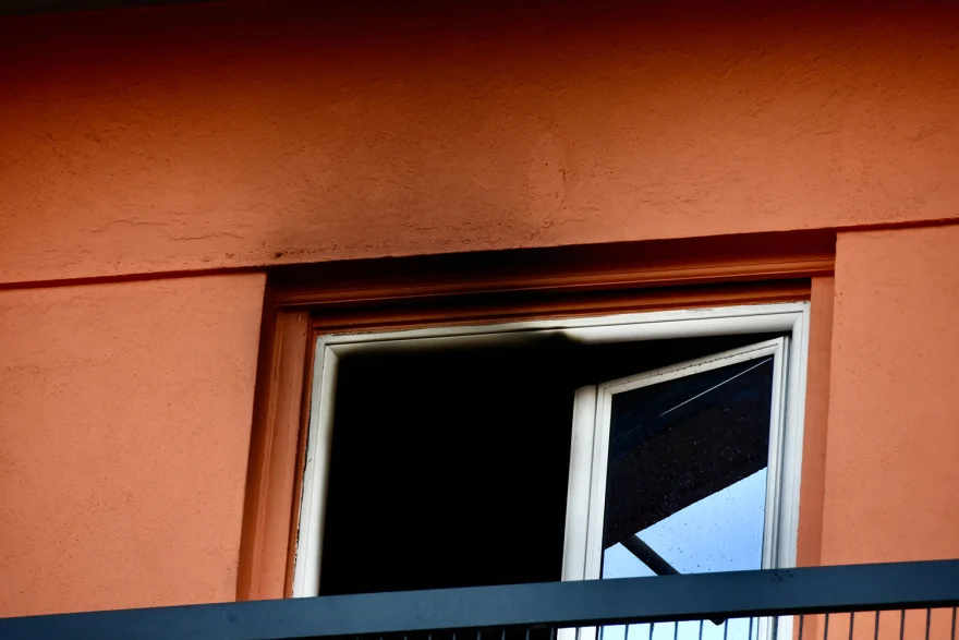 Η φωτιά στη Λιοσίων 121 δεν προκάλεσε εκτεταμένες ζημιές. Από τις φωτογραφίες φαίνονται τα καμένα σημεία έξω από το δωμάτιο.