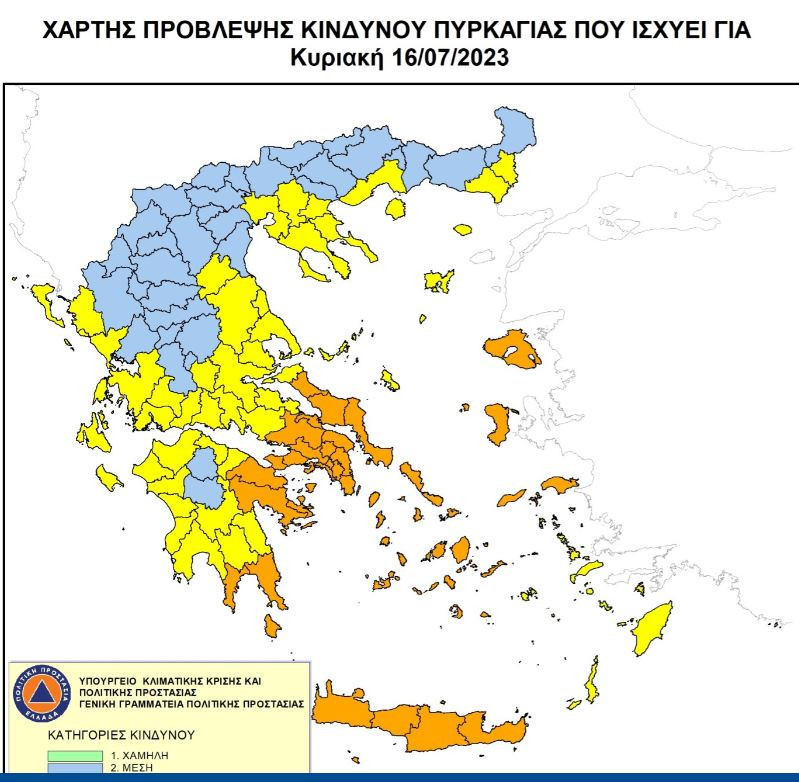 Συγκεκριμένα για σήμερα 16 Ιουλίου, προβλέπεται πολύ υψηλός κίνδυνος πυρκαγιάς για τις εξής περιοχές: