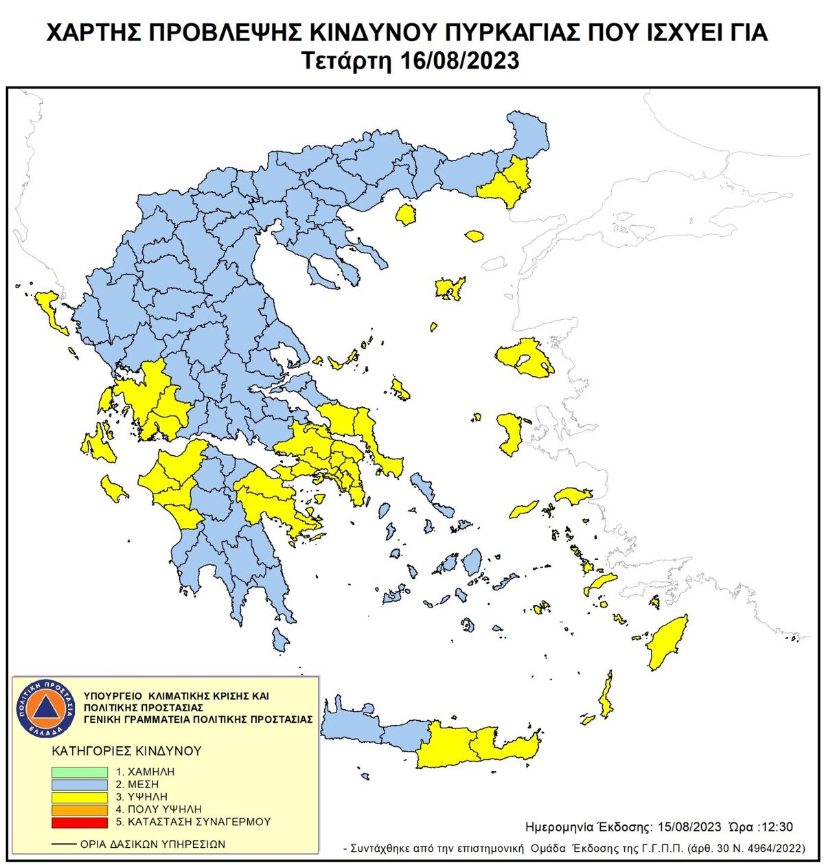 Για αύριο Τετάρτη 16 Αυγούστου, σύμφωνα με το ψάρτη πρόβλεψης κινδύνου πυρκαγιάς που εκδίδει η Γενική Γραμματεία Πολιτικής Προστασίας του Υπουργείου Κλιματικής Κρίσης & Πολιτικής Προστασίας, προβλέπεται υψηλός κίνδυνος πυρκαγιάς (κατηγορία κινδύνου 3) για αρκετές περιοχές.