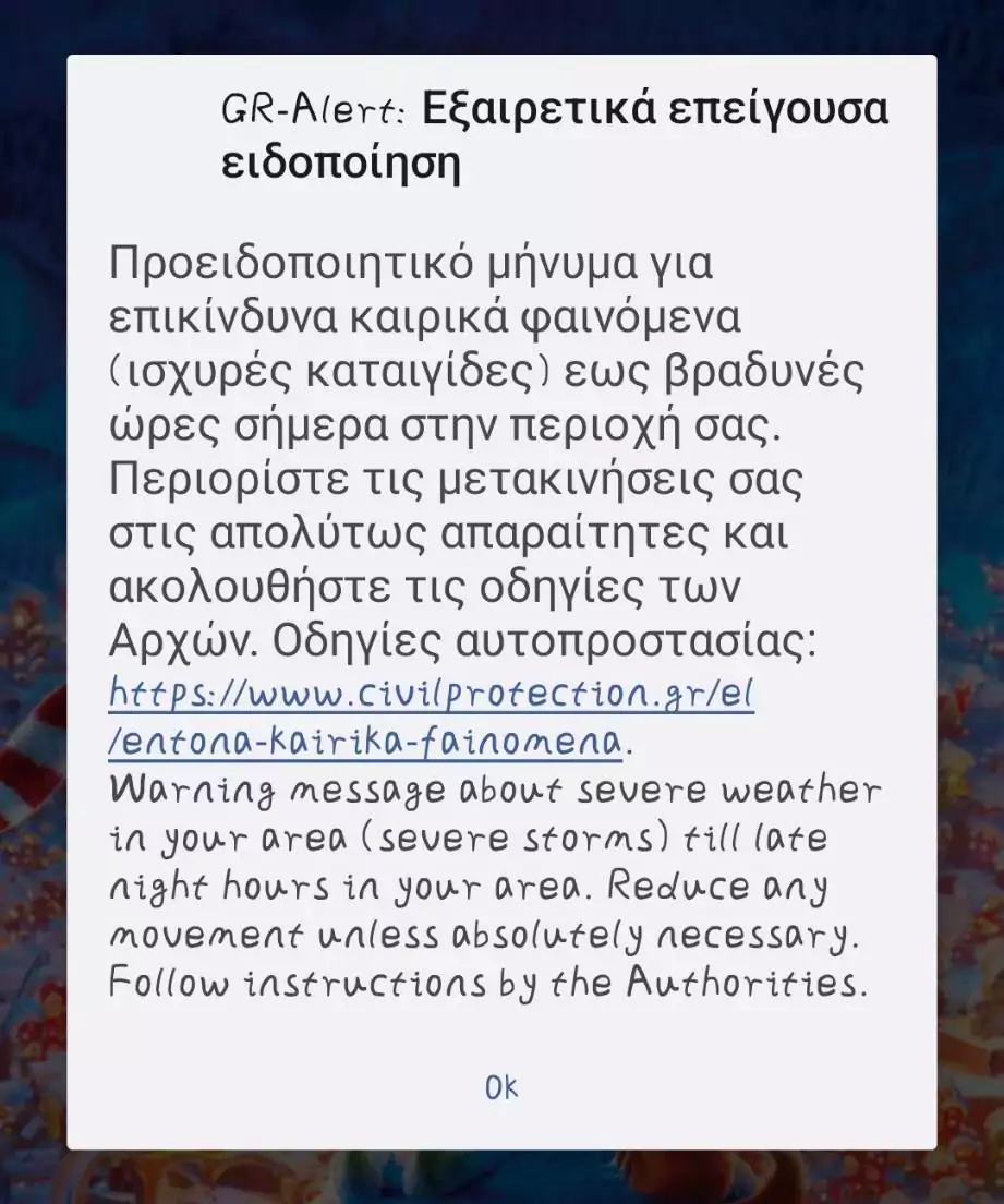 Πριν από λίγη ώρα οι κάτοικοι της Ζακύνθου και της Κεφαλλονιάς έλαβαν μήνυμα του 112 για επικίνδυνα καιρικά φαινόμενα στην περιοχή τους, μέχρι τις βραδινές ώρες της Τετάρτης (30/11).
