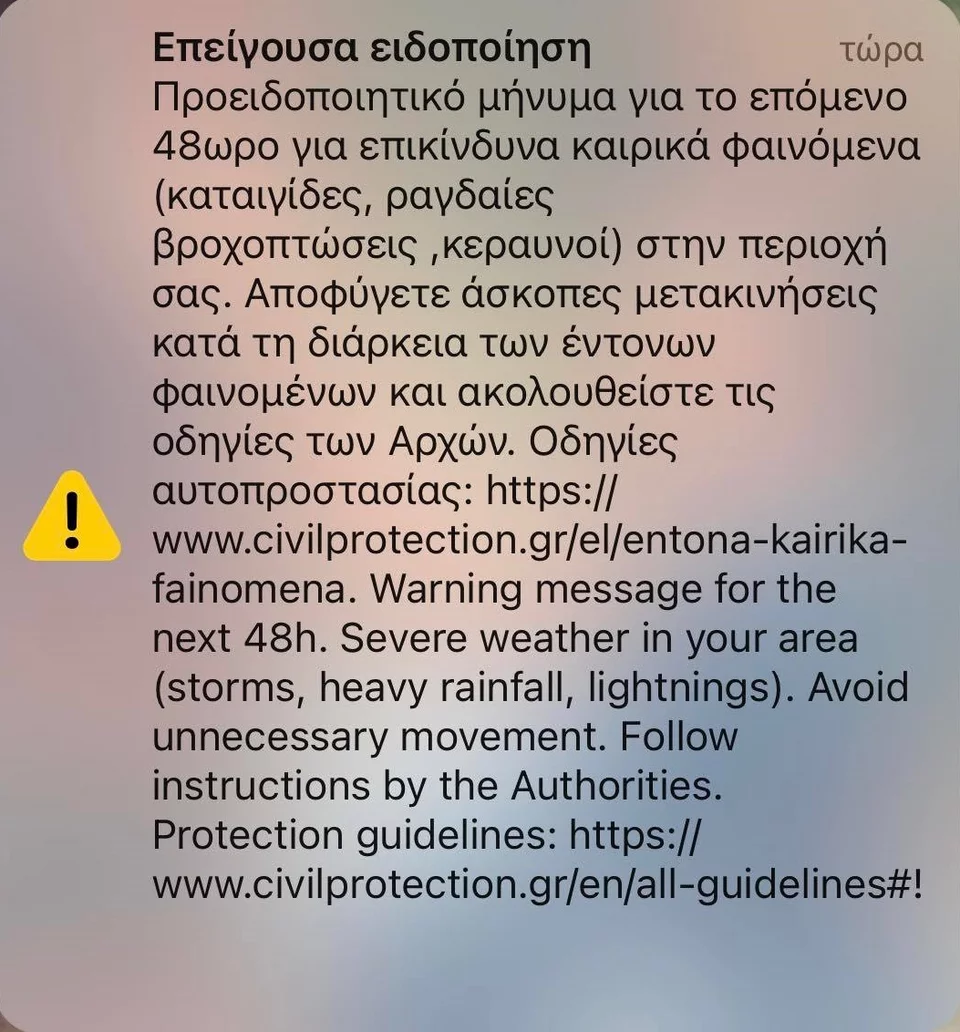 «Προειδοποιητικό μήνυμα για το επόμενο 48ωρο για επικίνδυνα καιρικά φαινόμενα (καταιγίδες, ραγδαίες βροχοπτώσεις, κεραυνοί) στην περιοχή σας. Αποφύγετε άσκοπες μετακινήσεις κατά τη διάρκεια των έντονων φαινομένων και ακολουθείστε τις οδηγίες των Αρχών. Οδηγίες αυτοπροστασίας: https://www.civilprotection.gr/el/entona-kairika-fainomena», αναφέρει το μήνυμα του 112.