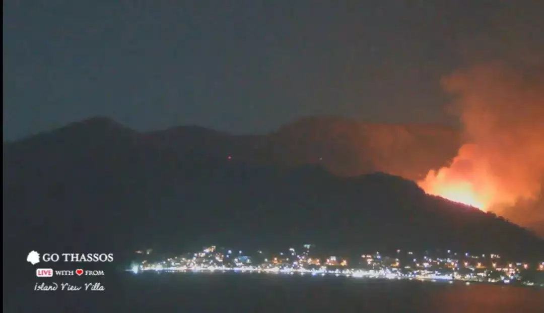Η μεγάλη φωτιά στη Θάσο στη Σκάλα Ποταμιάς αναζωπυρώθηκε λίγο πριν τα μεσάνυχτα της Παρασκευής (12/8).