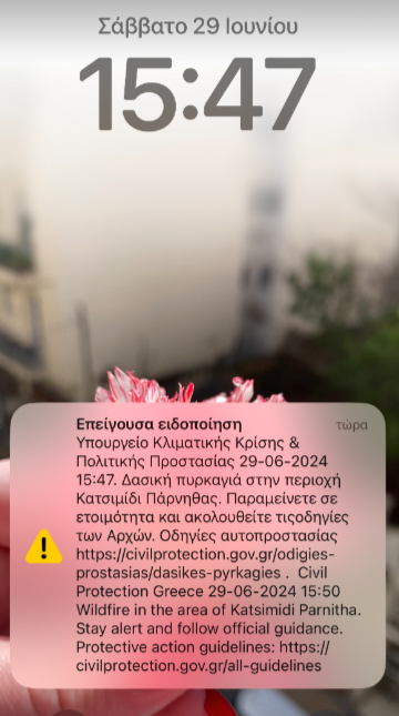 Λίγο πριν τις 16:00 ήχησε το 112 με το μήνυμα «Δασική πυρκαγιά στην περιοχή Κατσιμίδι Πάρνηθας. Παραμείνετε σε ετοιμότητα και ακολουθείτε τις οδηγίες των Αρχών».