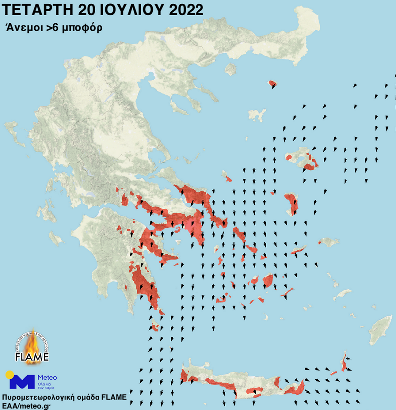 Με βάση τα τελευταία διαθέσιμα προγνωστικά στοιχεία της πυρομετεωρολογικής ομάδας FLAME του Εθνικού Αστεροσκοπείου Αθηνών (ΕΑΑ) / meteo.gr, πολύ δυσμενείς πυρομετεωρολογικές συνθήκες αναμένεται να επικρατήσουν στην Ελλάδα από την Τετάρτη 20/07/2022 έως και τουλάχιστον την Κυριακή 24/07/2022. Αιτία αποτελούν οι σημαντικά ενισχυμένοι βόρειοι άνεμοι (>6 μποφόρ) που θα πνέουν έως και την Πέμπτη 21/07/2022, σε συνδυασμό με τη σταδιακή άνοδο της θερμοκρασίας (>37-38 C) και την επικράτηση περισσότερο ξηρών ατμοσφαιρικών συνθηκών πλησιάζοντας το Σαββατοκύριακο 23 – 24/07/2022.