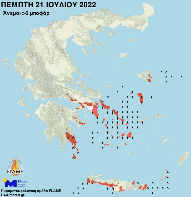 – Πολύ υψηλό δυναμικό εκδήλωσης δασικών πυρκαγιών καθοδηγούμενων από τον άνεμο αναμένουμε σε Αττική, Κ. και Ν. Εύβοια, Βοιωτία, Κορινθία, Αργολίδα, Λακωνία, Κυκλάδες, Χίο, Ικαρία, Ν. και Αν. Κρήτη, και τοπικά σε Αρκαδία, Αχαϊα, Φθιώτιδα, Σαμοθράκη, Λέσβο, Σάμο, Σκύρο, Κάσο και Κάρπαθο.