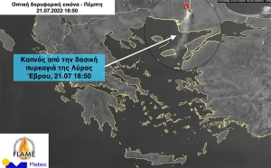 Συγκεκριμένα, η δορυφορική εικόνα του METEOSAT-11 δείχνει τον καπνό από τη δασική πυρκαγιά στην ευρύτερη περιοχή της Λύρας στον Έβρο. Οι ΒΑ άνεμοι έχουν ως αποτέλεσμα ο καπνός αυτή τη στιγμή να μεταφέρεται πάνω από το Θρακικό πέλαγος και την Ίμβρο, διανύοντας απόσταση σχεδόν 120 km.