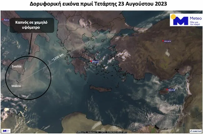 Χαρακτηριστική είναι η δορυφορική εικόνα που επεξεργάστηκε το Εθνικό Αστεροσκοπείο Αθηνών/meteo.gr το πρωί της Τετάρτης (23/8), η οποία δείχνει την έκταση που καλύπτει ο καπνός από τις πυρκαγιές στην Ελλάδα. Ειδικά στην περιοχή της Σικελίας και της Μάλτας, η ποιότητα του αέρα είναι εξαιρετικά χαμηλή λόγω της υψηλής συγκέντρωσης μικροσωματιδίων PM10 και PM2.5.
