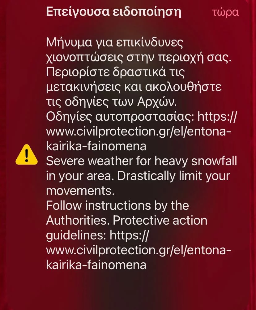 «Έρχονται επικίνδυνες χιονοπτώσεις, περιορίστε δραστικά τις μετακινήσεις» προειδοποιεί το μήνυμα.