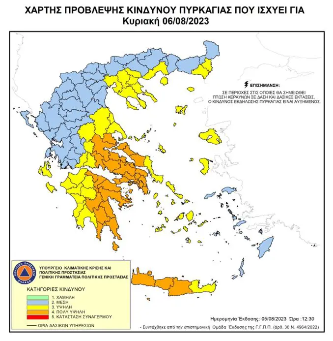 Σύμφωνα με το χάρτη πρόβλεψης κινδύνου πυρκαγιάς που εκδίδει η Γενική Γραμματεία Πολιτικής Προστασίας του Υπουργείου Κλιματικής Κρίσης & Πολιτικής Προστασίας (www.civilprotection.gr), πολύ υψηλός κίνδυνος να ξεσπάσει φωτιά (κατηγορία κινδύνου 4) προβλέπεται για 6 περιφέρειες αύριο Κυριακή (6.8.2023).