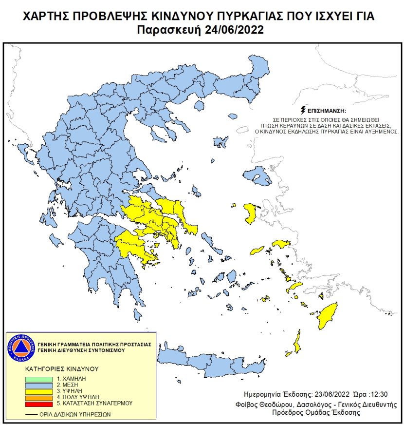 Πολύ υψηλό κίνδυνο εκδήλωσης φωτιάς αντιμετωπίζουν συνολικά 12 περιοχές της χώρας την Παρασκευή (24/06), όπως προκύπτει από το νεό Χάρτη Πρόβλεψης Κινδύνου Πυρκαγιάς που εξέδωσε η Πολιτική Προστασία