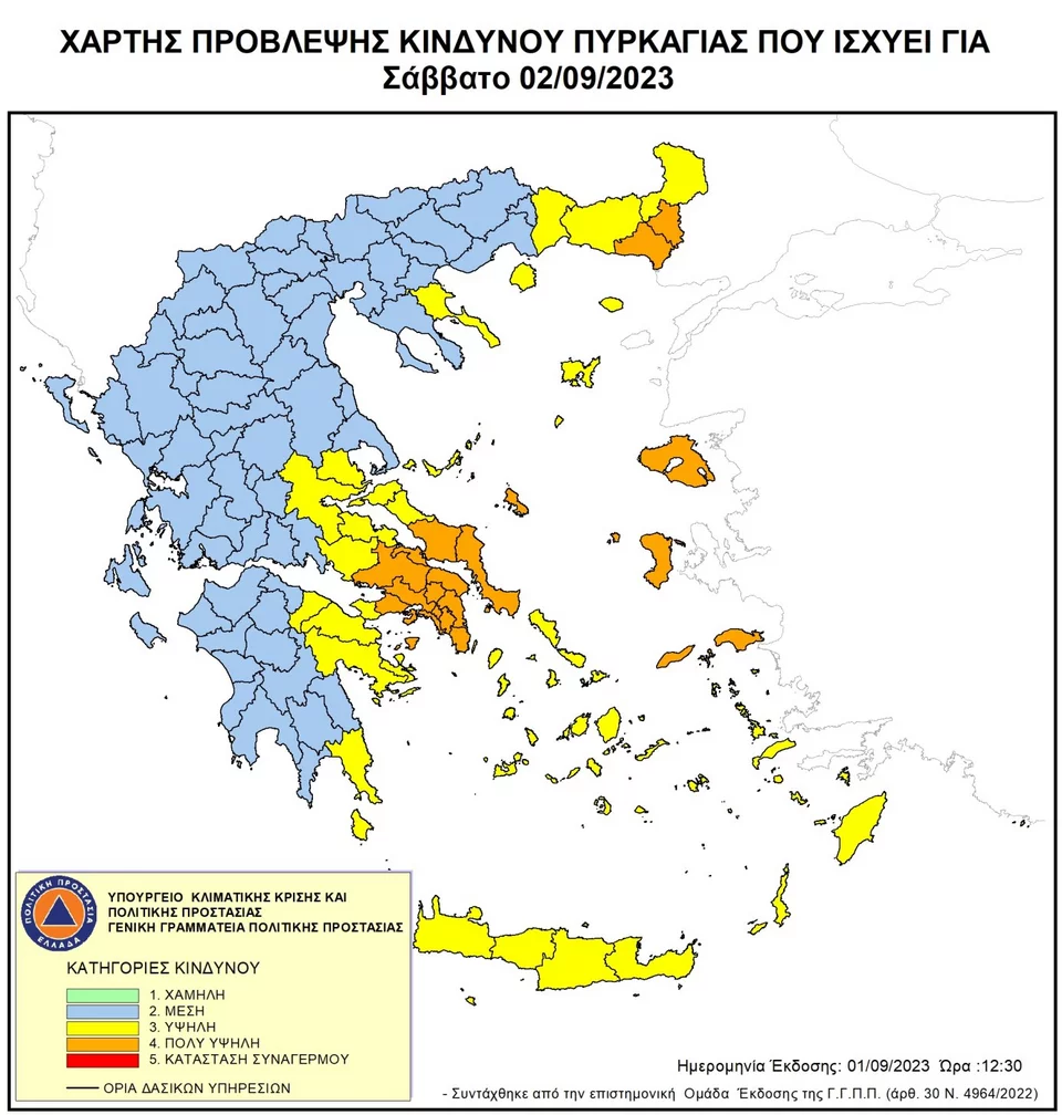 Σύμφωνα με το Χάρτη Πρόβλεψης Κινδύνου Πυρκαγιάς που εκδίδει η Γενική Γραμματεία Πολιτικής Προστασίας του υπουργείου Κλιματικής Κρίσης και Πολιτικής Προστασίας (civilprotection.gov.gr), η μισή χώρα βρίσκεται σε ετοιμότητα για παν ενδεχόμενο.
