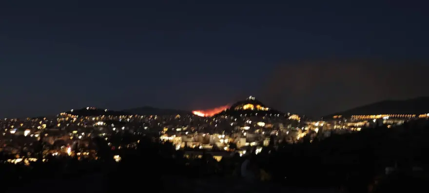 Σαν μια πύρινη «κουβέρτα» να έχει σκεπάσει τον ουρανό και να δημιουργεί ένα απόκοσμο φόντο στην Ακρόπολη και τον Λυκαβηττό. Η φωτιά συνεχίζει να κατακαίει την Πεντέλη.