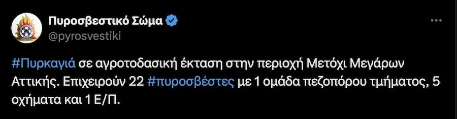«Πυρκαγιά σε αγροτοδασική έκταση στην περιοχή Μετόχι Μεγάρων Αττικής. Επιχειρούν 22 πυροσβέστες με 1 ομάδα πεζοπόρου τμήματος, 5 οχήματα και 1 Ε/Π».