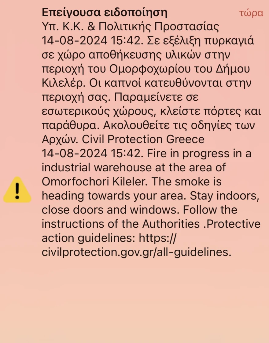 Στην ειδοποίηση του 112 στις 15:42, αναφέρονται τα εξής: «Σε εξέλιξη πυρκαγιά σε χώρο αποθήκευσης υλικών στην περιοχή του Ομορφοχωρίου του Δήμου Κιλελέρ. Οι καπνοί κατευθύνονται στην περιοχή σας. Παραμείνετε σε εσωτερικούς χώρους, κλείστε πόρτες και παράθυρα».