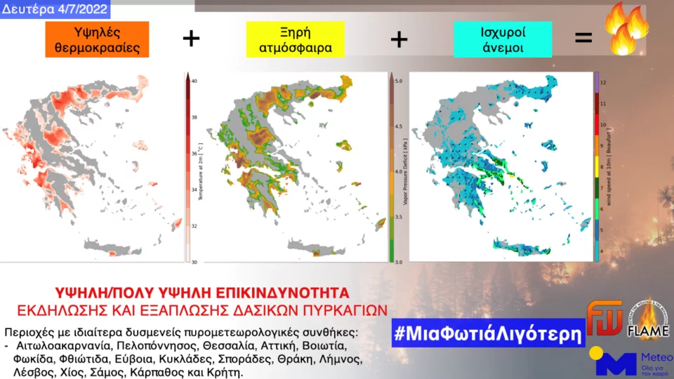 Σε συνέχεια των ενημερώσεων της πυρομετεωρολογικής μονάδας FLAME* του Εθνικού Αστεροσκοπείου Αθηνών (ΕΑΑ) / meteo.gr, και με βάση τα τελευταία διαθέσιμα προγνωστικά στοιχεία, οι δυσμενείς πυρομετεωρολογικές συνθήκες θα επιμείνουν σε μεγάλο μέρος της ανατολικής και νότιας χώρας κατά το διήμερο Δευτέρας και Τρίτης, 4 – 5 Ιουλίου 2022.