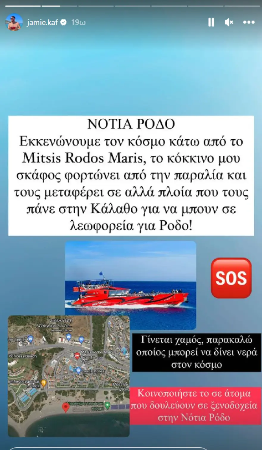 Νωρίτερα και πάλι μέσω Instagram, ο Τζέιμς Καφετζής ενημέρωσε τον κόσμο ότι: «Εκκενώνουμε τον κόσμο κάτω από το Mitsis Rodos Maris, το κόκκινό μου σκάφος φορτώνει από την παραλία και τους μεταφέρει σε άλλα πλοία που τους πάνε στην Κάλαθο για να μπουν σε λεωφορεία για Ρόδο», για όσους έχει σπεύσει να παραλάβει».