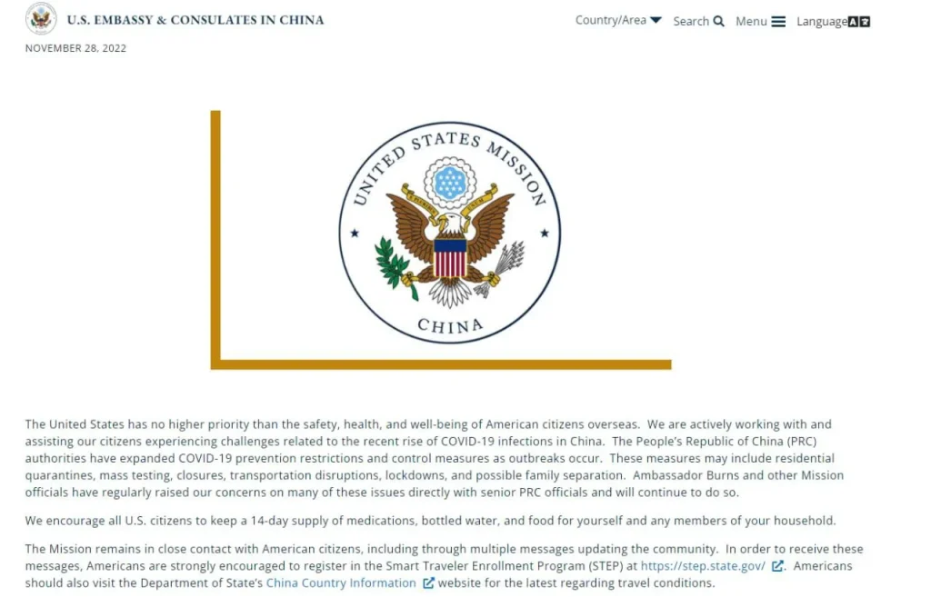 «Οι Ηνωμένες Πολιτείες δεν έχουν μεγαλύτερη προτεραιότητα από την ασφάλεια, την υγεία και την ευημερία των Αμερικανών πολιτών στο εξωτερικό. Συνεργαζόμαστε ενεργά και βοηθάμε τους πολίτες μας που αντιμετωπίζουν προκλήσεις που σχετίζονται με την πρόσφατη αύξηση των μολύνσεων από τον COVID-19 στην Κίνα».