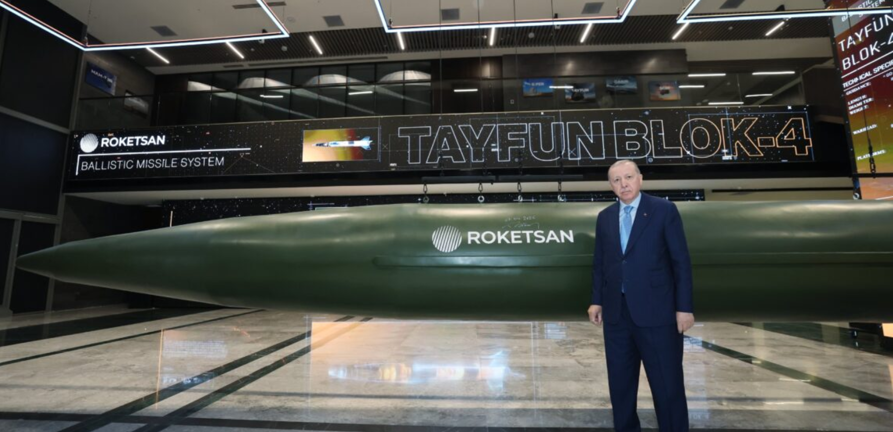 Κατά τη διάρκεια της τελετής, ο Τούρκος πρόεδρος υπέγραψε συμβολικά πάνω στη νέα έκδοση του βαλλιστικού πυραύλου Tayfun Block-4, υπογραμμίζοντας τη σημασία που αποδίδει η Άγκυρα στην ανάπτυξη προηγμένων οπλικών συστημάτων.