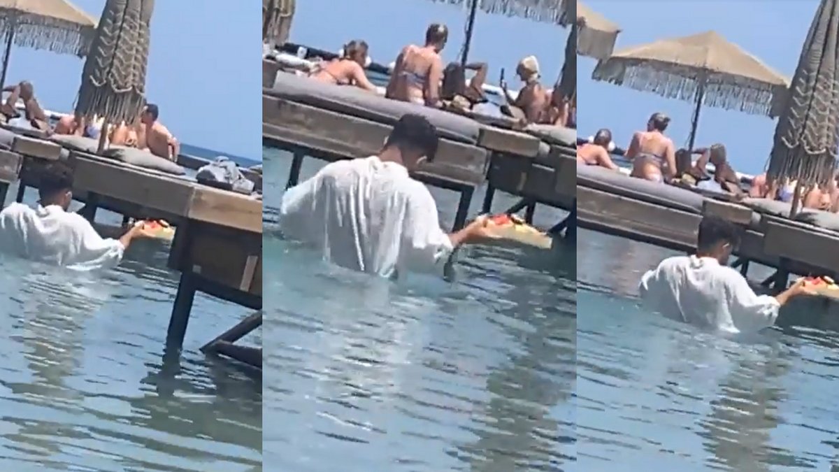 Ο νεαρός σερβιτόρος, ο οποίος φαίνεται σε βίντεο που ήρθε στη δημοσιότητα, να μεταφέρει φαγητό σε πλατφόρμα που έχει στηθεί σε παραλία λίγο έξω από την πόλη της Ρόδου, δήλωσε πως «δεν με ενοχλεί αυτός ο τρόπος σερβιρίσματος».