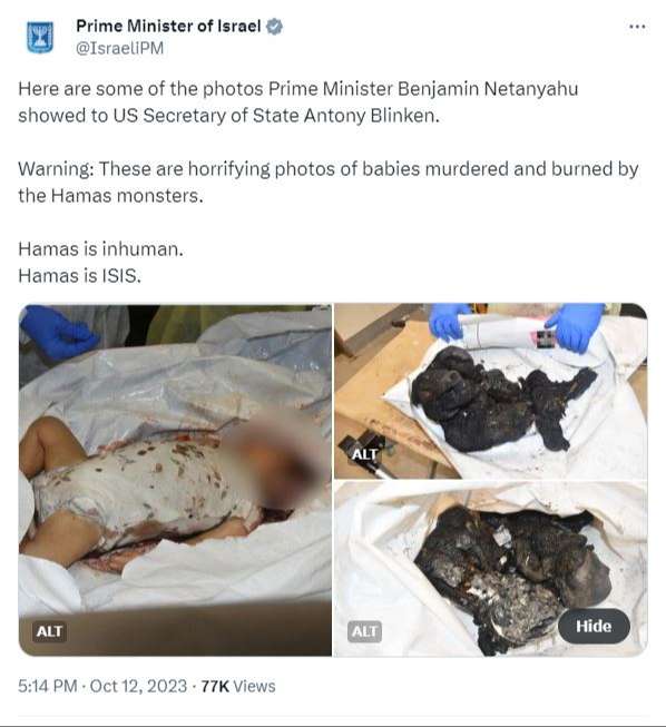 Σοκάρουν οι εικόνες που έδειξε ο πρωθυπουργός του Ισραήλ, Μπέντζαμιν Νετανιάχου, στον υπουργό Εξωτερικών των ΗΠΑ, Άντονι Μπλίνκεν, από σφαγμένα και καμμένα βρέφη μετά τις επιθέσεις της Χαμάς.