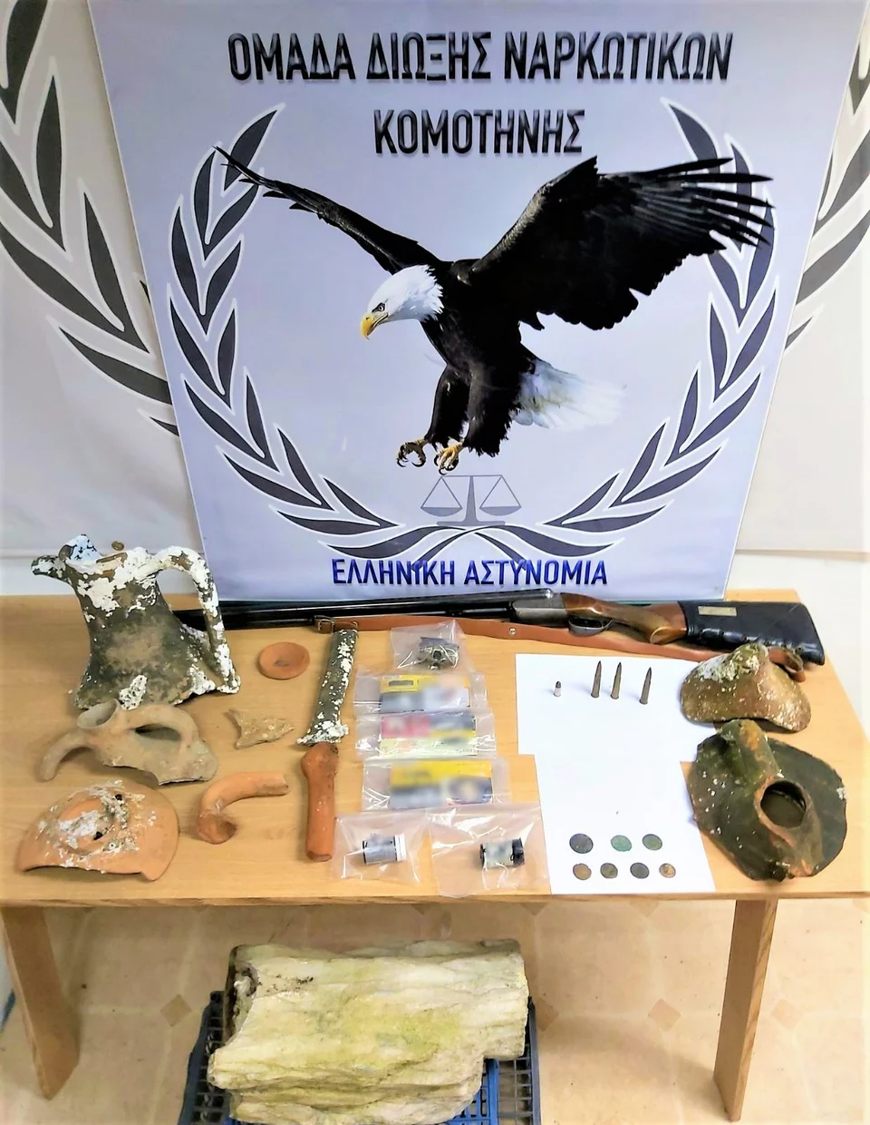 Ειδικότερα, αστυνομικοί του Τμήματος Ασφαλείας της Κομοτηνής, μετά από μία συντονισμένη επιχείρηση, κατάφεραν να συλλάβουν έναν άνδρα, καθώς μετά από έρευνα στο σπίτι του αλλά και σε ένα τροχόσπιτο που διατηρεί, βρέθηκαν τρεις νάιλον συσκευασίες και δύο κουτιά με ακατέργαστη κάνναβη βάρους 61,8 γραμμαρίων, 1 κυνηγετικό όπλο, 1 περίστροφο, καθώς και 10 τμήματα αρχαίων αμφορέων, 7 αρχαία νομίσματα και 1 θραύσμα επεξεργασμένου αρχαίου μαρμάρου.