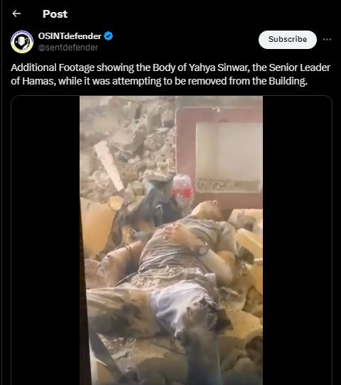 Ο ηγέτης της Χαμάς, Γιαχία Αλ Σινουάρ είναι νεκρός, καθώς σκοτώθηκε από ισραηλινά πυρά σήμερα (17/10) το μεσημέρι, με εικόνες τόσο από τα τελευταία προσωπικά του αντικείμενα, όσο και από το πτώμα του, να δημοσιεύονται στο X.