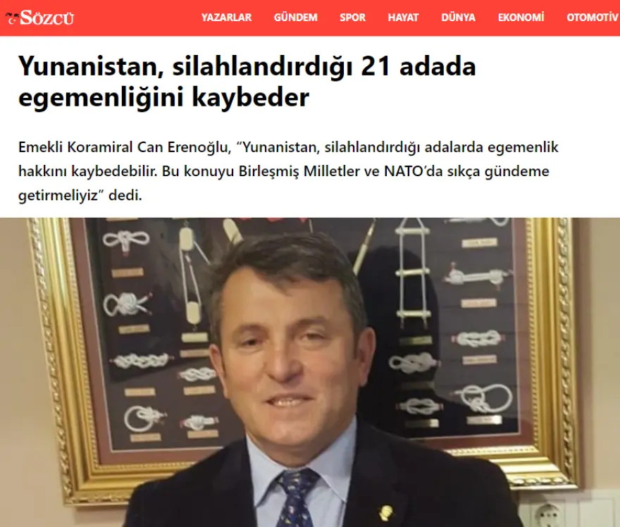 Η τουρκική φιλοκυβερνητική εφημερίδα Σοτζού φιλοξενεί δηλώσεις του απόστρατου αντιναύαρχου Τζαν Ερένογλου οι οποίες φέρουν τον τίτλο «Η Ελλάδα χάνει την κυριαρχία στα 21 νησιά που έχει εξοπλίσει».