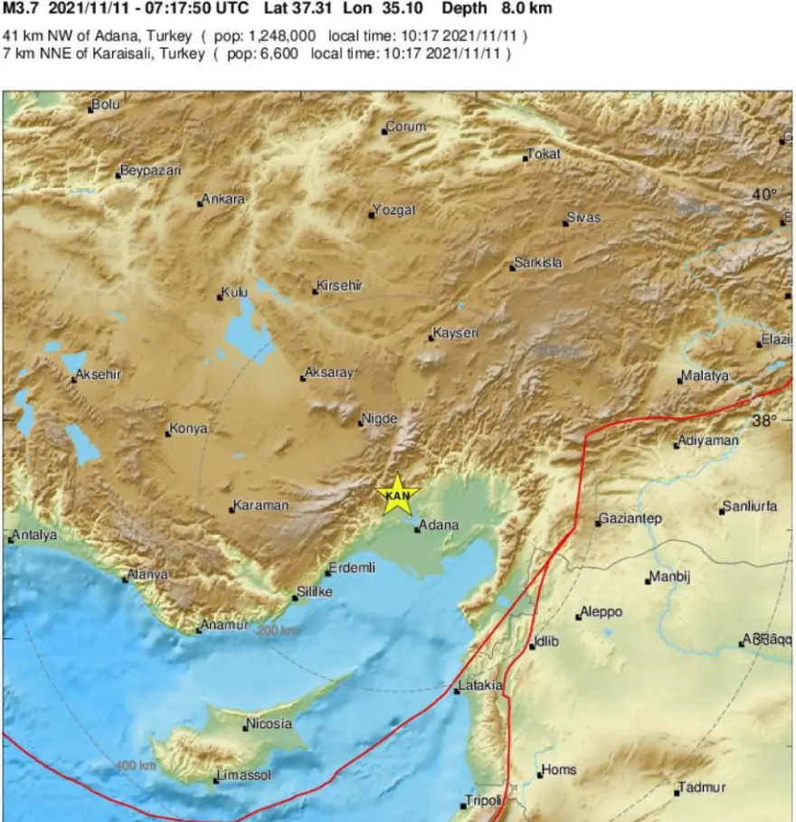 Σεισμική δόνηση μεγέθους 3,8 βαθμών της κλίμακας Ρίχτερ σημειώθηκε το πρωί της Πέμπτης 11 Νοεμβρίου στη νότια Τουρκία, κοντά στα Άδανα.