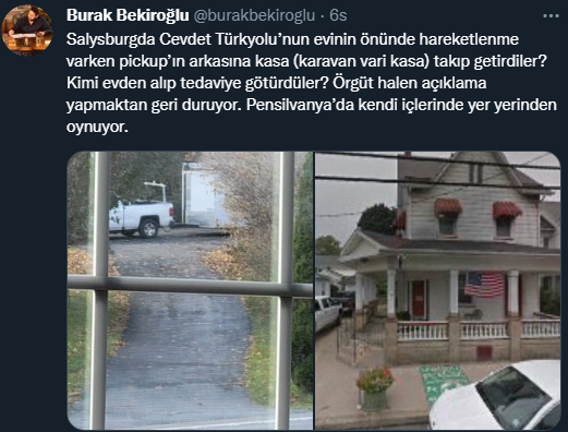 “Αυτή τη στιγμή, υπάρχει κίνηση γύρω από το σπίτι του πιο στενού ανθρώπου του Φετουλάχ Γκιουλέν, του Τζεβντέτ Τουρκιόλου, στο Σαϊλόρσμπουργκ της Πενσυλβάνια. Πλήθος κόσμου περιφέρεται γύρω από το σπίτι του. Φαίνεται σαν κάποιος να είναι νεκρός… Οι άνθρωποι στη γειτονιά είναι ανάστατοι και παρακολουθούν έντρομοι τι συμβαίνει.”