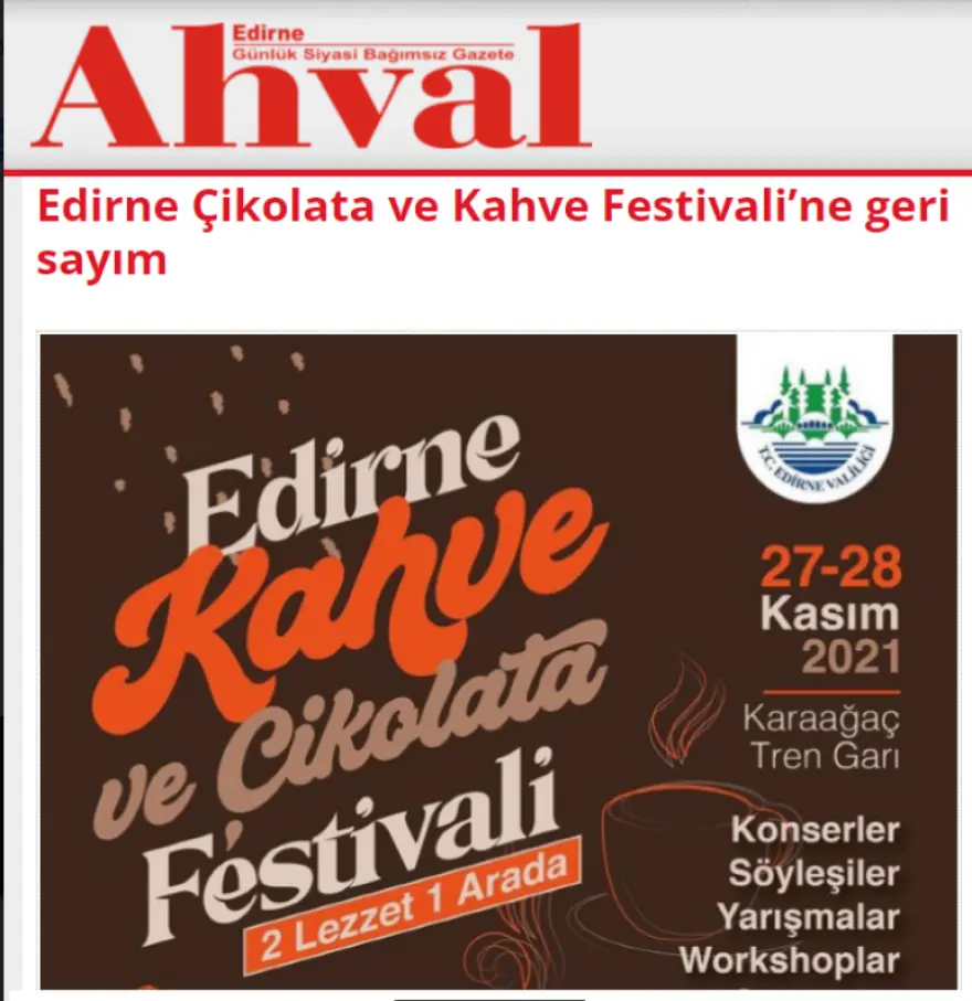 Μπορεί στην Τουρκία αυτή τη στιγμή η αγορά τουρκικού… καφέ να γίνεται με «δελτίο», ο δήμος Αδριανούπολης όμως κοντά στα σύνορα με την Ελλάδα, διοργανώνει στις 27 και 28 Νοεμβρίου το: «Φεστιβάλ Καφέ και σοκολάτας».