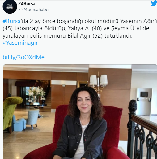 Σύμφωνα με την Hurriyet, το αιματηρό περιστατικό σημειώθηκε το περασμένο Σάββατο σε κεντρικό δρόμο της Προύσας. Ο Μπιλάλ Αγκίρ, όπως ονομάζεται ο 52χρονος δράστης, είχε χωρίσει από την Γιασεμίν πριν από δύο μήνες. Βλέποντας το απόγευμα του περασμένου Σαββάτου το αμάξι που οδηγούσε η πρώην του, και στο οποίο επέβαινε ένας άνδρας, ο αστυνομικός σταμάτησε το όχημα στην είσοδο ενός πάρκινγκ και, μετά από σύντομο διαπληκτισμό, πυροβόλησε την 45χρονη και τον συνεπιβάτη της.