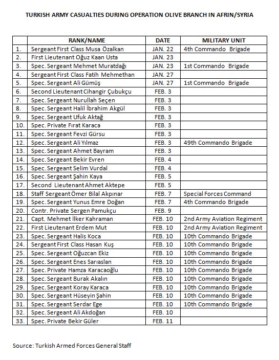 Στους 33 ανέρχονται μέχρι στιγμής οι νεκροί Τούρκοι στρατιώτες από την επιχείρηση «Κλάδος Ελαίας». Όλοι τους, εκτός από τους 2 πιλότους του T-129 ανήκουν στις ειδικές δυνάμεις και πιο συγκεκριμένα στην 1η, 2η, 10η και 49η Ταξιαρχίες ειδικών δυνάμεων.