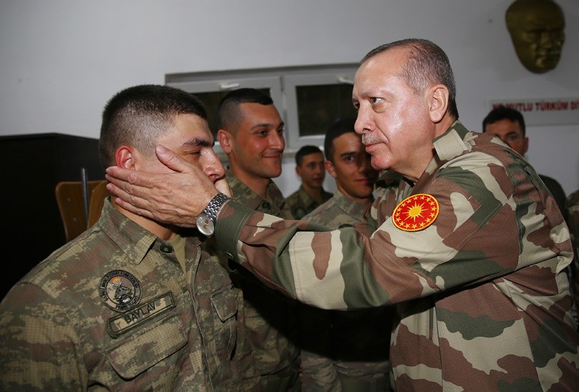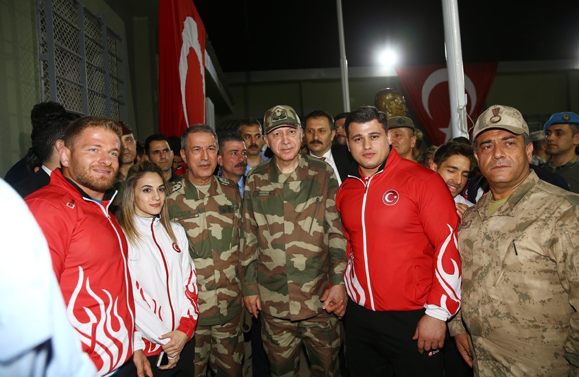 Την Κυριακή ο Τούρκος Πρόεδρος, με στρατιωτική αμφίεση, μαζί με γνωστούς καλλιτέχνες και αθλητές επισκέφθηκαν στρατιωτική βάση στην επαρχία Χατάι της Ν.Α. Τουρκίας, κοντά στα σύνορα με την Συρία.
