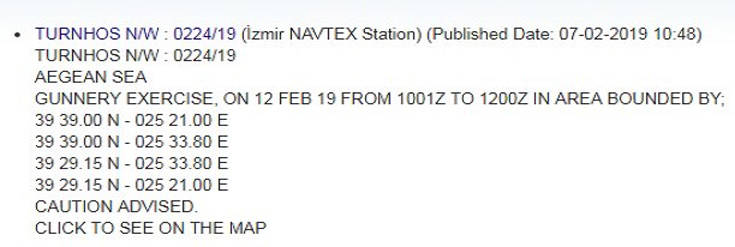 Συγκεκριμένα με την υπ’ αριθμόν 0224/19 NAVTEX δέσμευσε περιοχή κοντά στο ακριτικό ελληνικό νησί για άσκηση με τη χρήση όπλων για τις 12 Φεβρουαρίου.