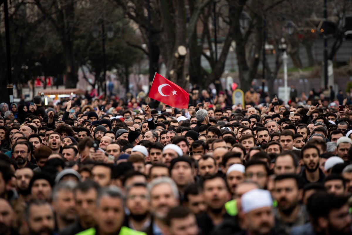 Εξω από την Αγιά Σοφιά συγκεντρώθηκαν μέλη κυρίως ισλαμικών οργανώσεων, όπου ξεδίπλωσαν πανό με συνθήματα όπως “Μουσουλμάνοι, ενωθείτε” και “Μουσουλμάνοι, ψηλά το κεφάλι”.