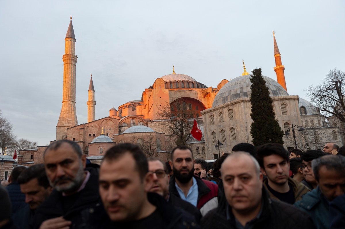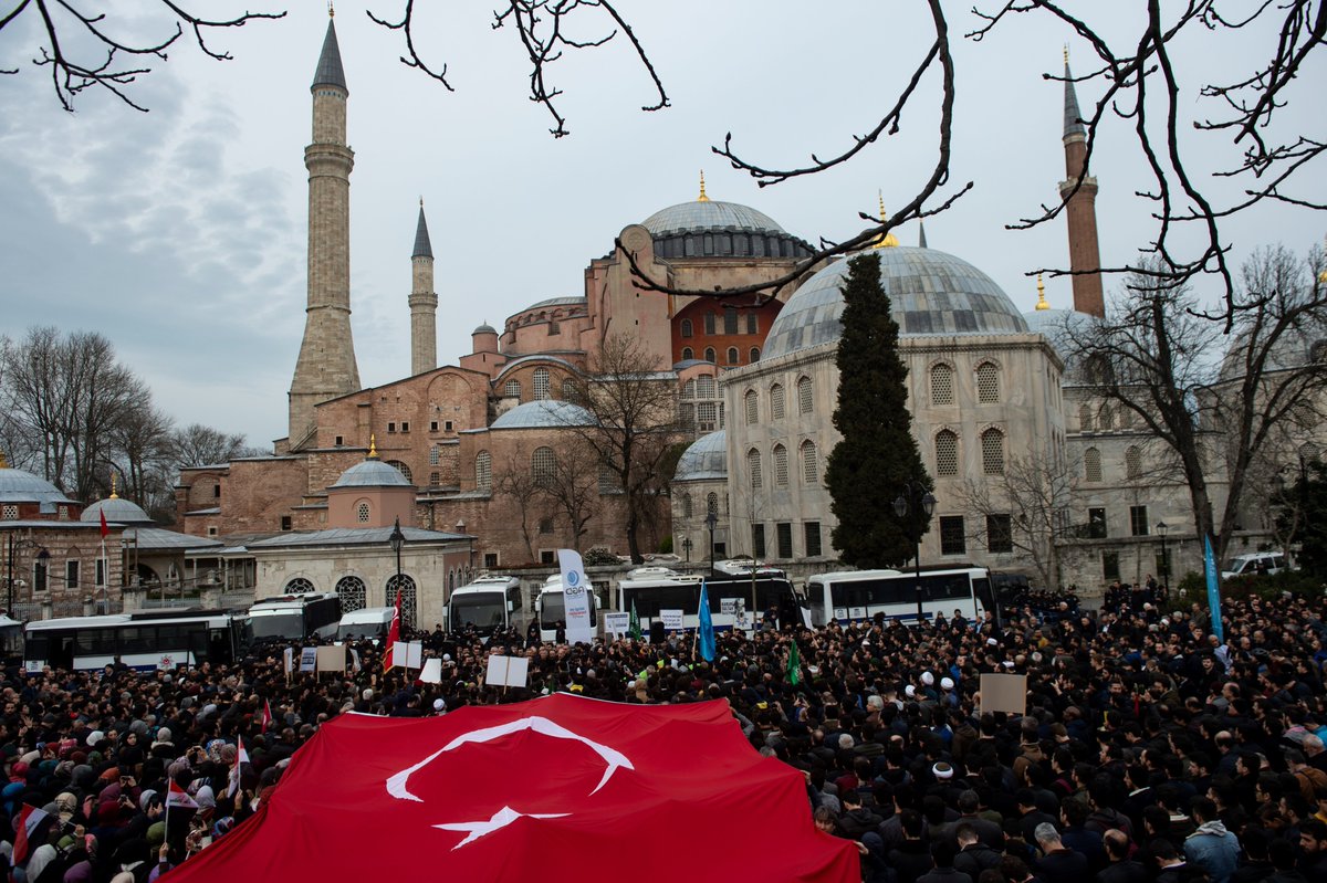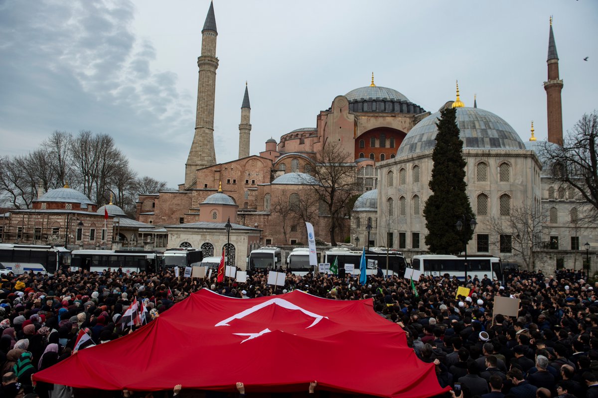 Εξω από την Αγιά Σοφιά συγκεντρώθηκαν μέλη κυρίως ισλαμικών οργανώσεων, όπου ξεδίπλωσαν πανό με συνθήματα όπως “Μουσουλμάνοι, ενωθείτε” και “Μουσουλμάνοι, ψηλά το κεφάλι”.