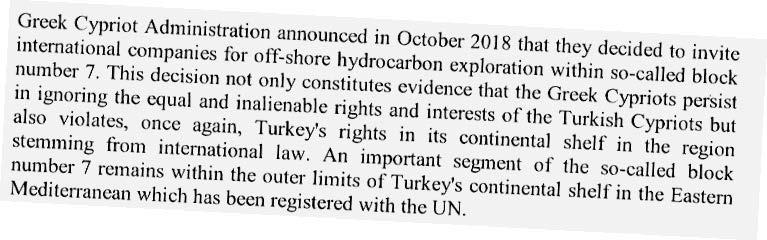 «Η ελληνοκυπριακή διοίκηση ανακοίνωσε τον Οκτώβριο του 2018 ότι αποφάσισε να προσκαλέσει διεθνείς εταιρείες για την εξερεύνηση υδρογονανθράκων ανοικτής θάλασσας μέσα στο λεγόμενο οικόπεδο 7. Η απόφαση αυτή δεν αποτελεί μόνο απόδειξη ότι οι Ελληνοκύπριοι επιμένουν να αγνοούν τα ίσα και αναφαίρετα δικαιώματα και συμφέροντα των Τουρκοκυπρίων, αλλά παραβιάζει για άλλη μια φορά τα δικαιώματα της Τουρκίας στην ηπειρωτική της υφαλοκρηπίδα στην περιοχή, τα οποία απορρέουν από το διεθνές δίκαιο.