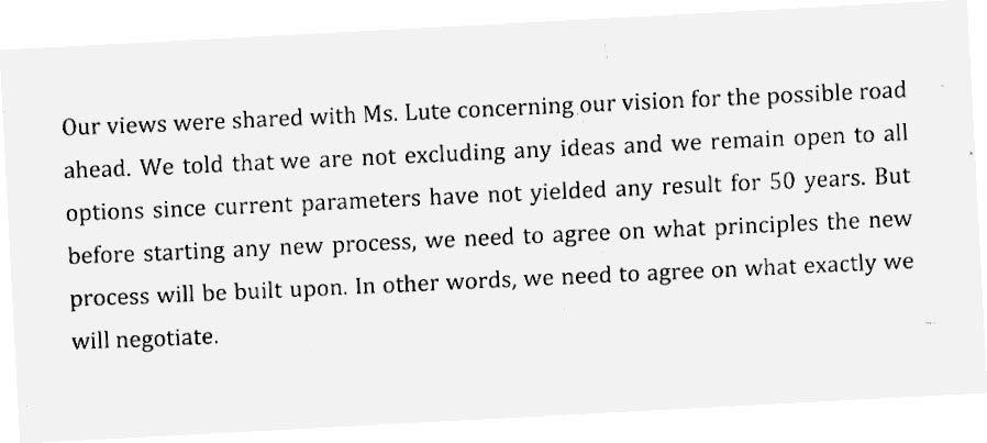 Το έγγραφο της Άγκυρας (βλέπε φωτοτυπία) αναφέρει ακόμη ότι «μοιραστήκαμε τις θέσεις μας με την κ. Λουτ, σε σχέση με το όραμά μας για την πιθανή μελλοντική πορεία. Είπαμε ότι δεν αποκλείουμε καμιά ιδέα και ότι παραμένουμε ανοικτοί σε όλες τις επιλογές, καθώς οι υφιστάμενες παράμετροι δεν απέδωσαν κανένα αποτέλεσμα για 50 χρόνια. Αλλά πριν ξεκινήσουμε μια νέα διαδικασία, θα πρέπει να συμφωνήσουμε επί ποίων αρχών θα οικοδομηθεί η νέα διαδικασία» προσθέτει το τουρκικό έγγραφο, διευκρινίζοντας ότι «με άλλα λόγια θα πρέπει να συμφωνήσουμε τι ακριβώς θα διαπραγματευθούμε».