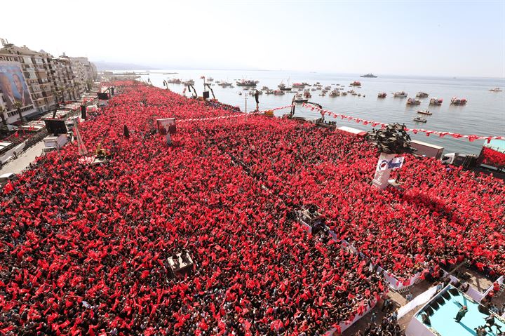 «Σμύρνη εσύ που επούλωσες τις πληγές της Θεσσαλονίκης, της Κρήτης, της μεγάλης βαλκανικής πόλης των Σκοπίων, της Βάρνας», είπε ο Τούρκος πρόεδρος απευθυνόμενος στο πλήθος των οπαδών του.