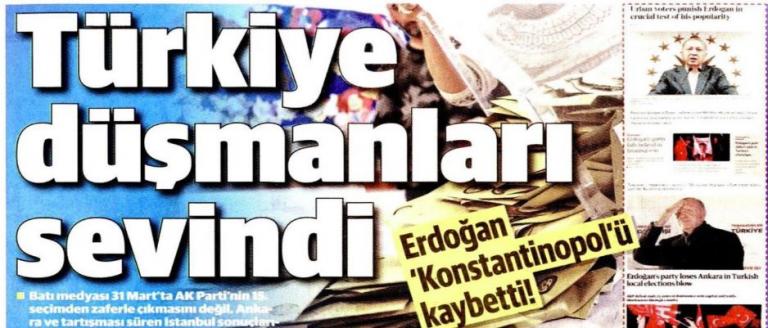 Πιο συγκεκριμένα, η τουρκική φιλοκυβερνητική εφημερίδα Yeni Safak, αναφέρει σε πρωτοσέλιδο δημοσίευμα της, αναφορικά με την απώλεια της Κωνσταντινούπολης για το κόμμα του Ρ. Ερντογάν: «Χάρηκαν οι εχθροί της Τουρκίας», σημειώνοντας ότι στον ελληνικό Τύπο, τα πρωτοσέλιδα έχουν τίτλο «Ο Ερντογάν έχασε την Κωνσταντινούπολη». Σημειώνει μεταξύ άλλων ότι τα ελληνικά ΜΜΕ επιμένουν να αποκαλούν την Πόλη «Κωνσταντινούπολη», κάτι που όπως υποστηρίζει η εφημερίδα «κάνει εντύπωση»…