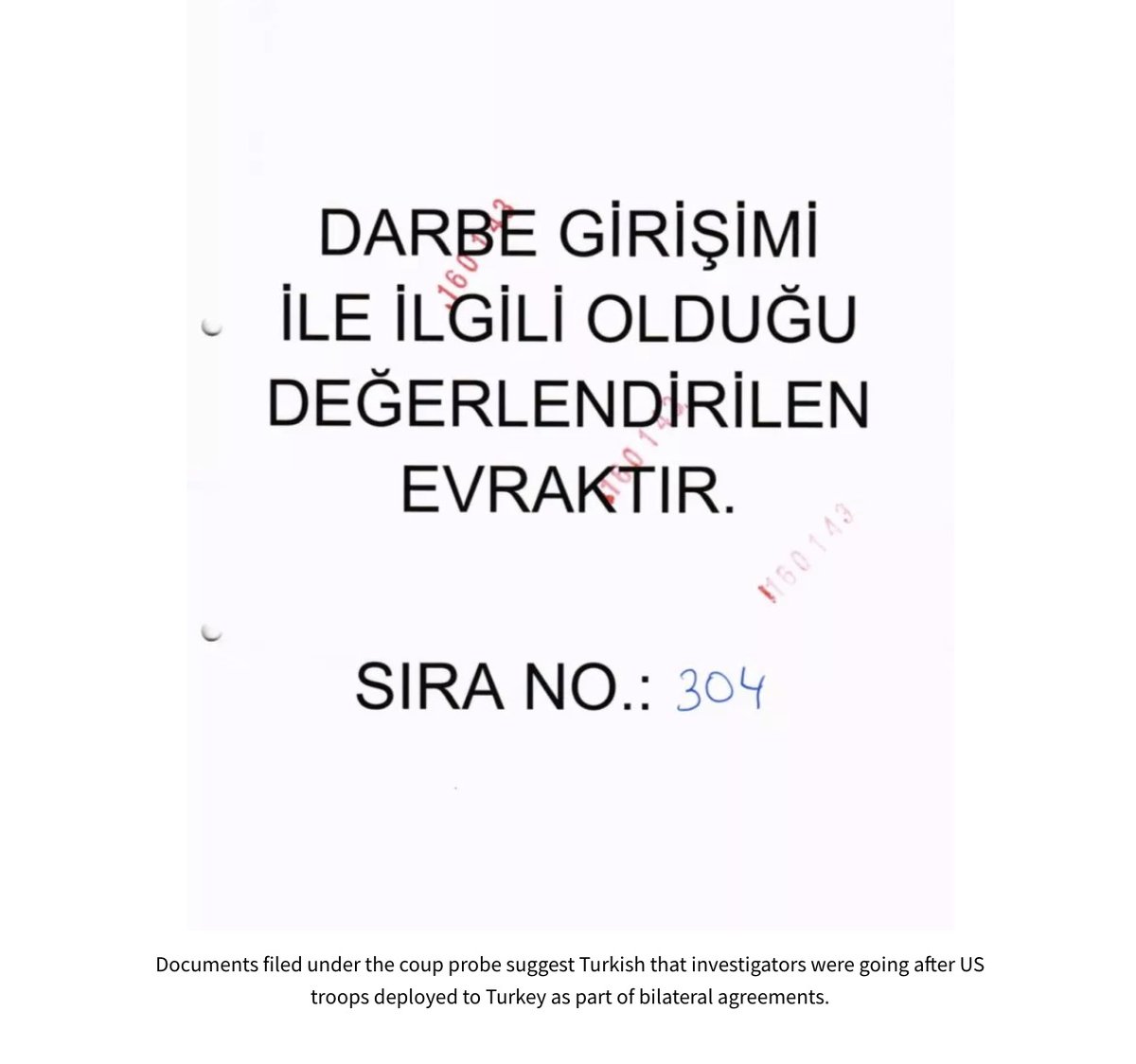 Τα τουρκικά έγγραφα έχουν αναλυτικές εκθέσεις και πληροφορίες για τις κινήσεις όλων των Αμερικανών στρατιωτικών στην Τουρκία. Στρατιωτικά σχέδια, μετακινήσεις δυνάμεων, μυστικές πτήσεις από και προς την Τουρκία, όλα περιέχονται στον φάκελο με τίτλο “Ο ρόλος των ΗΠΑ στην απόπειρα πραξικοπήματος”.
