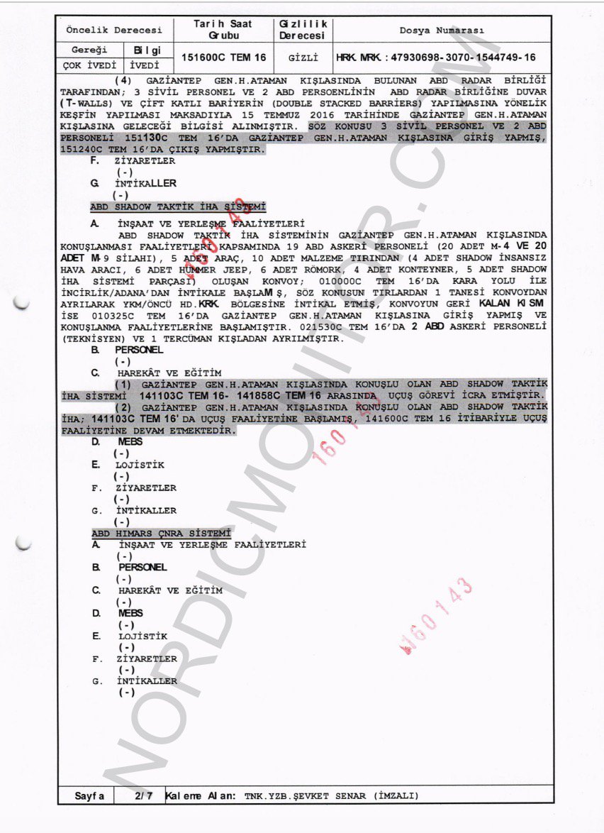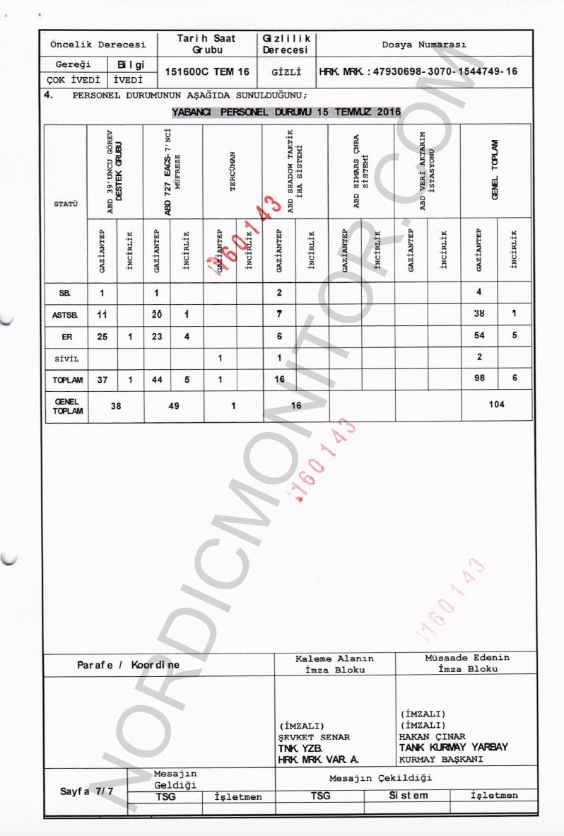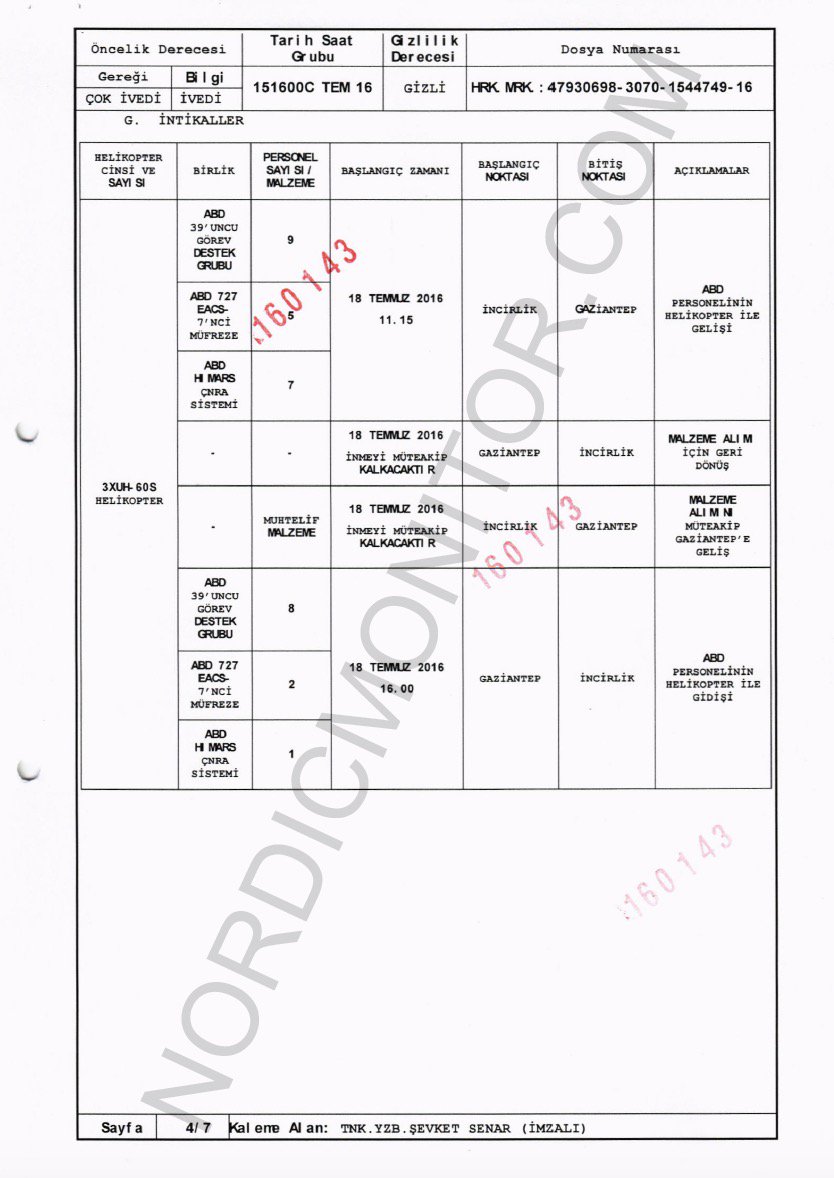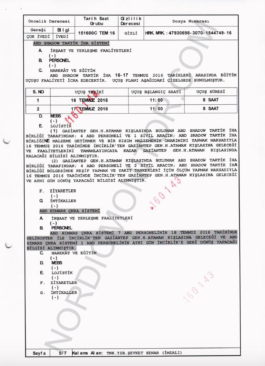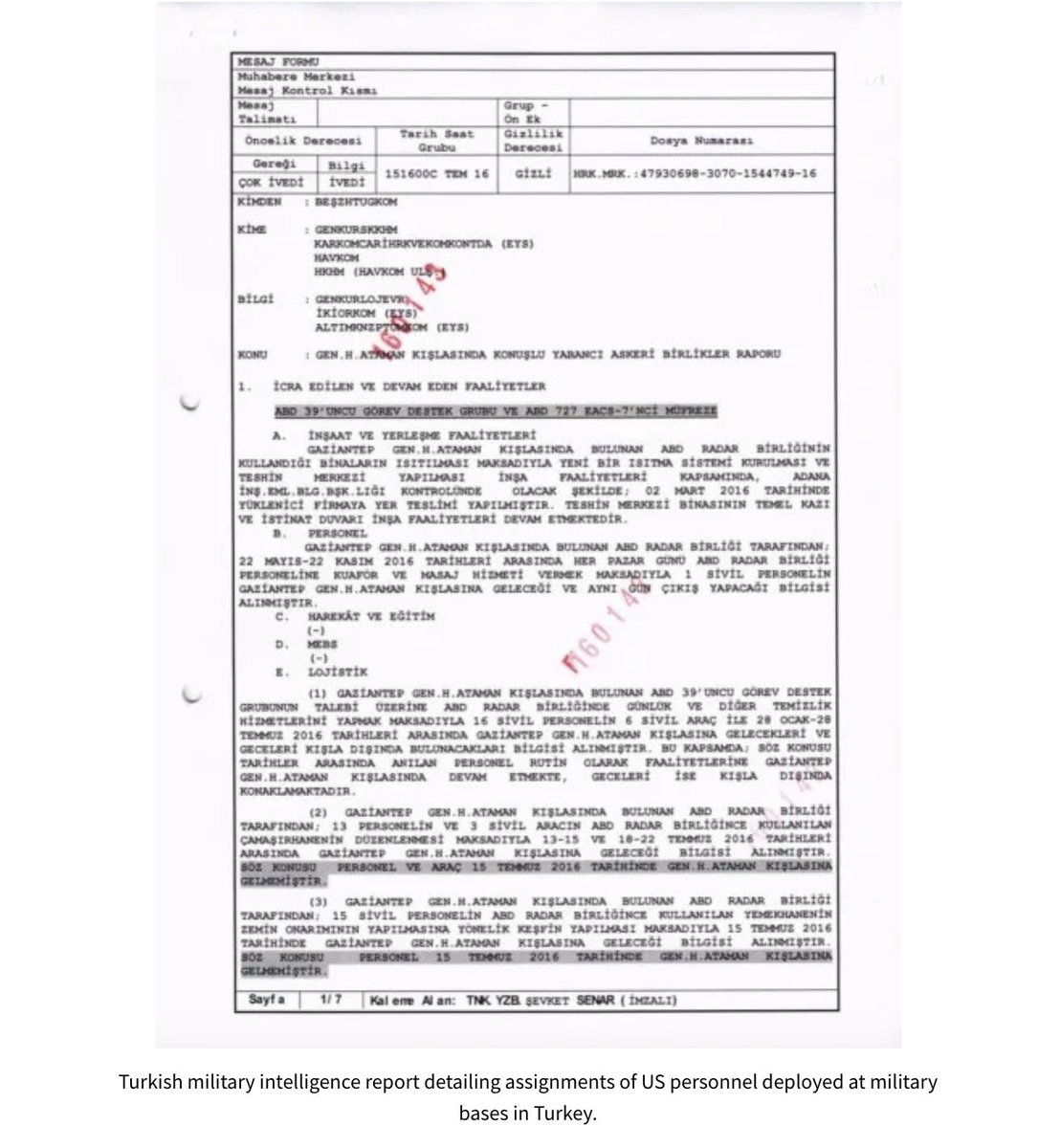 Τα τουρκικά έγγραφα έχουν αναλυτικές εκθέσεις και πληροφορίες για τις κινήσεις όλων των Αμερικανών στρατιωτικών στην Τουρκία. Στρατιωτικά σχέδια, μετακινήσεις δυνάμεων, μυστικές πτήσεις από και προς την Τουρκία, όλα περιέχονται στον φάκελο με τίτλο “Ο ρόλος των ΗΠΑ στην απόπειρα πραξικοπήματος”.