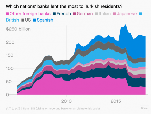 Παρόλο που οι ισπανικές τράπεζες ήταν μακράν οι μεγαλύτεροι δανειστές για την Τουρκία, οι γαλλικές, ιταλικές και γερμανικές τράπεζες έχουν επίσης σημαντική έκθεση στο τουρκικό χρέος.