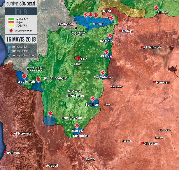 Οπως μπορούμε να δούμε και στον χάρτη παρακάτω ο Ρ.Τ.Ερντογάν κατόπιν συμφωνίας με την Ρωσία έχει αναπτύξει στρατιωτικές δυνάμεις σε πάνω από 10 φυλακια στην Ιντλίμπ. Ταυτόχρονα, υπάρχουν ανεπτυγμένες τουρκικές δυνάμεις σε Αφρίν, περιμετρικά της Μάνμπιτζ αλλά και άλλες έτοιμες για προέλαση ανατολικά του Ευφράτη.