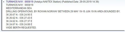 Με την NAVTEX 0659/19 δεσμεύει περιοχή στα ανοιχτά του κόλπου της Αλεξανδρέττας για το χρονικό διάστημα από 29 Μαΐου μέχρι 15 Ιουνίου για την διενέργεια γεωτρήσεων με το δεύτερο γεωτρύπανο ROWAN NORWAY.
