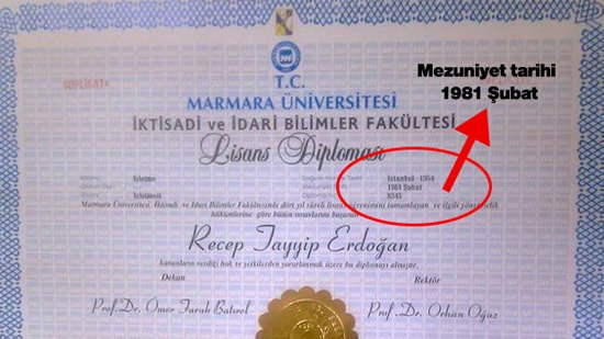 Σημειώνεται ότι η φωτοτυπία του πανεπιστημιακού τίτλου που υπέβαλε ο Ερντογάν στην Ανώτατη Εφορευτική Επιτροπή, για να του επιτραπεί να συμμετέχει ως υποψήφιος στις προεδρικές εκλογές, λέει ότι ο Ερντογάν αποφοίτησε το Φεβρουάριο του 1981, από το Πανεπιστήμιο του Μαρμαρά, το οποίο όμως ιδρύθηκε to 1982 ή για την ακρίβεια πήρε αυτήν την ονομασία και αναγνωρίστηκε ως ανώτατο εκπαιδευτικό ίδρυμα, ως μετεξέλιξη της Ακαδημίας Οικονομικών και Εμπορικών Επιστημών, σύμφωνα με τη σελίδα του Πανεπιστημίου: