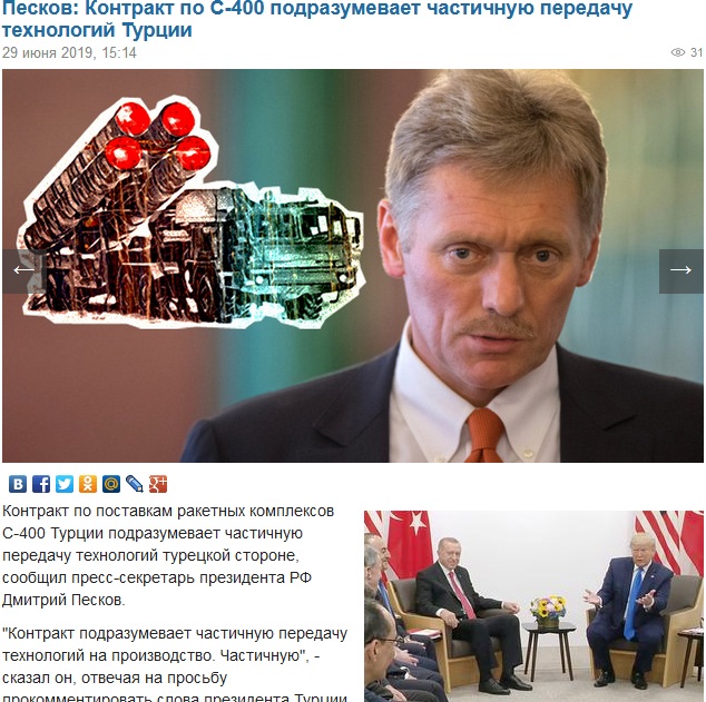 Κληθείς να σχολιάσει δηλώσεις του Τούρκου προέδρου ο εκπρόσωπος του Κρεμλίνου Dmitry Peskov, επιβεβαίωσε ότι στη συμφωνία με την Τουρκία, για τα S-400 περιλαμβάνεται και η μεταφορά τεχνογνωσίας προς την Τουρκία.