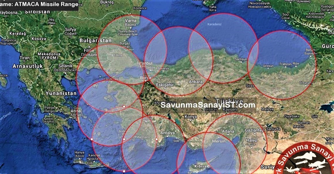 Ο χάρτης με τις ακτίνες δράσης που δημοσιεύουμε, αφορά εκτοξεύσεις από επίγειους εκτοξευτές από τα βάθη της Τουρκίας!